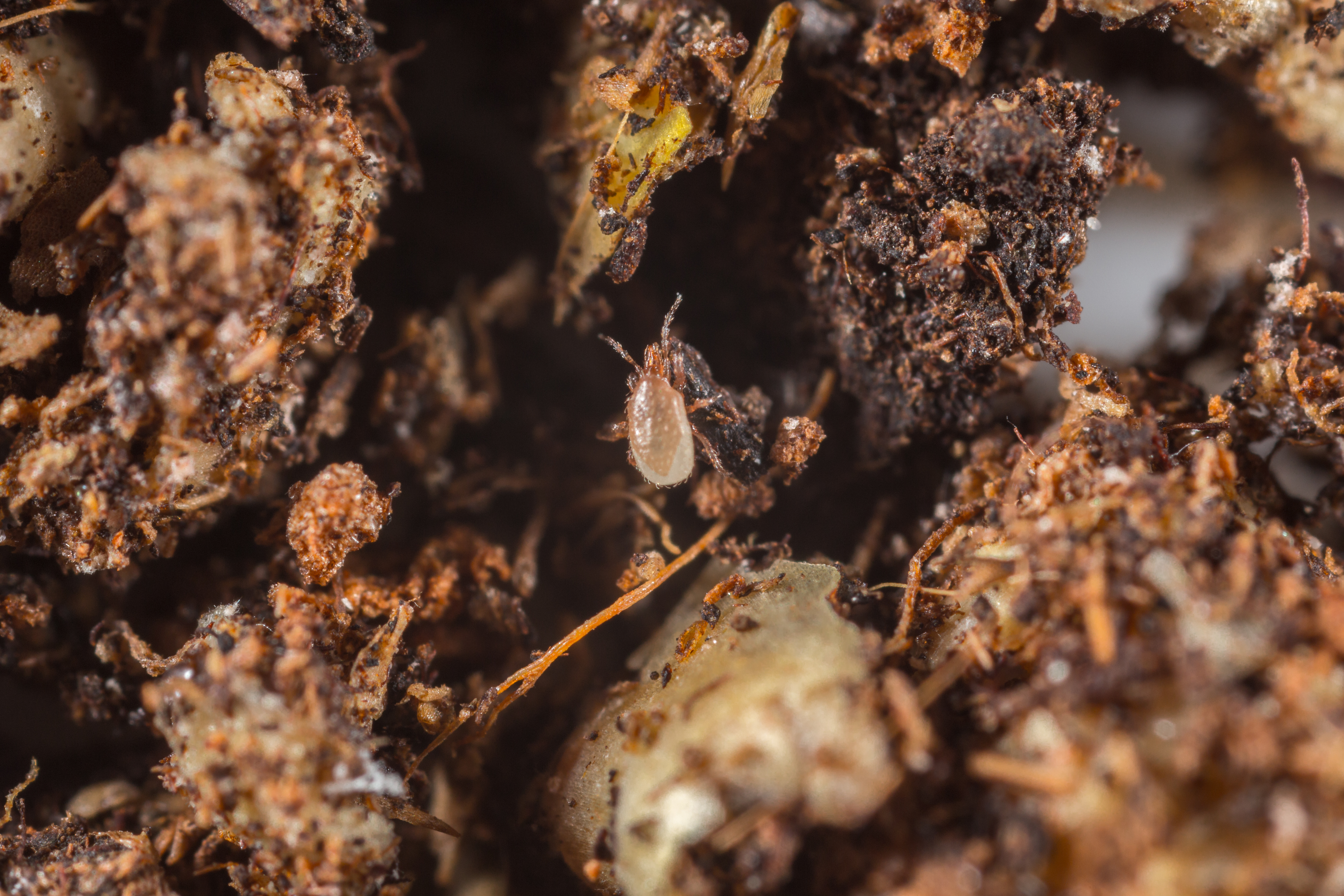 Eier, Larven und Puppen der Trauermücke; Puppen von Thripsen