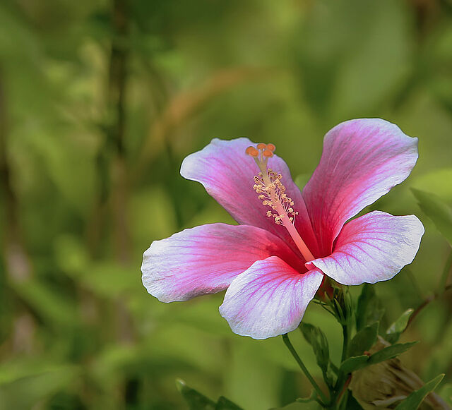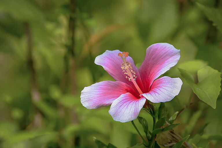 - Der Hibiskus ist bekannt für seine großen trompetenförmigen Blüten. Er gehört zu den Malvengewächsen (Malvaceae). Die Blüten haben fünf oder mehr Blütenblätter und ihre Farbe variiert von Weiß über Rosa, Rot, Orange, Pfirsichfarben bis hin zu Gelb und Violett.