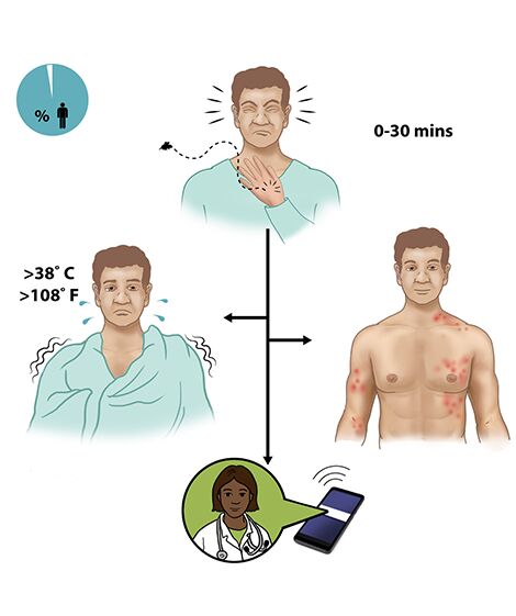 Konsultieren Sie bei Fieber oder einer Reaktion ersten Grades den Hausarzt. Dieser kann beschließen, abzuwarten. Eine Beobachtung im Krankenhaus ist ratsam, weil die Reaktion im weiteren Zeitverlauf an Intensität zunehmen kann.