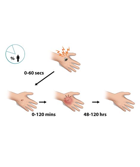 Normalerweise tritt nach dem Stich rund um die Einstichstelle eine Schwellung auf. Dabei handelt es sich um eine örtlich begrenzte, nicht allergische Reaktion.65> Der geschwollene Bereich ist gerötet und juckt. Die Reaktion kann sofort eintreten, zeigt sich meist jedoch erst mehrere Stunden nach dem Stich. Die Schwellung und der Juckreiz können mehrere Stunden und manchmal auch Tage anhalten. In einigen Fällen kann ein größerer Hautbereich um die Einstichstelle reagieren; dann dauert es entsprechend länger, bis die Schwellung sich zurückbildet. Auch dies ist noch eine lokal begrenzte, nicht allergische Reaktion.