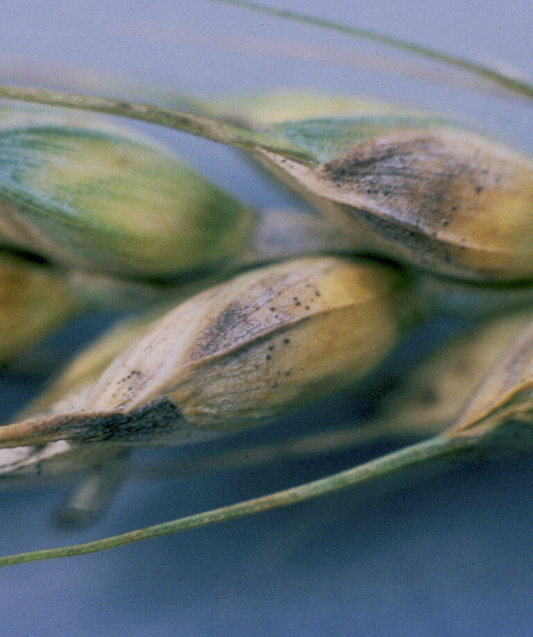 Auf Spelzen treten ähnliche braune Befallsstellen mit Pyknidien und Perithecien auf. Perithecien bilden sich auch auf toten Spelzen und Stängeln. Bei starkem Befall färben sich die Köpfe des Weizens schwarz, die Samen verschrumpeln und verformen sich. Infizierte Keimlinge verkümmern.