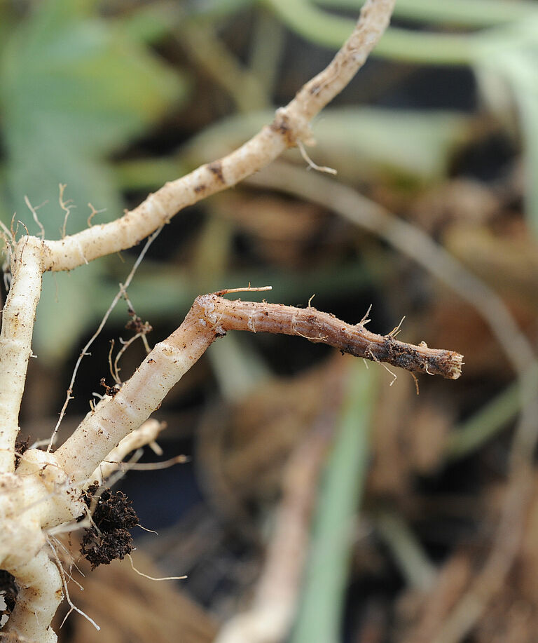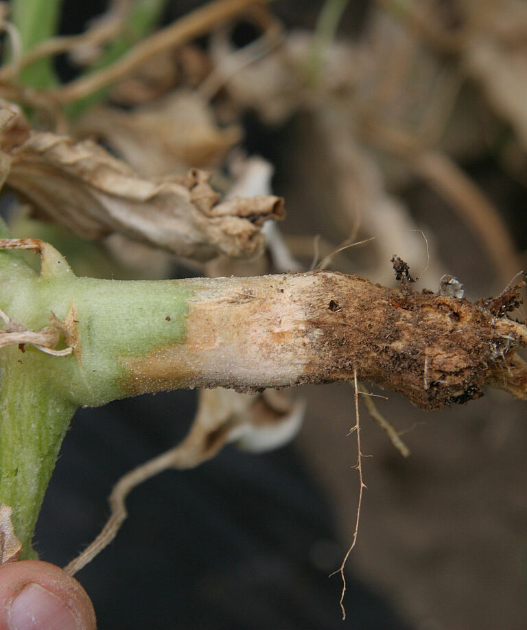 Die Erkrankung beschränkt sich normalerweise auf einige wenige Wurzeln, in schweren Fällen können jedoch alle Wurzeln betroffen sein. Im Endstadium der Erkrankung bleibt nur noch Gefäßgewebe übrig, weil die Rinde (äußere Schicht) verfault ist. Infektionen im Frühstadium der Pflanzen führen zu einem verkümmerten Wachstum und kleineren Blättern von intensiv grüner Farbe. Kommt es in diesem Stadium zu einer schweren Infektion, so können die Pflanzen absterben. Wenn die Infektion weniger schwer ist, können die Triebe in einem späten Stadium der Pflanze welken. Ist die Wasserversorgung im früheren Entwicklungsstadium mit hoher Verdunstung jedoch in irgendeiner Weise eingeschränkt, kann es zu einer vorzeitigen Welke kommen. Bei verwelkten Pflanzen sieht die Krone zunächst wässrig aus, wird hellbraun und sinkt ein. Später färbt sie sich schwarz und es zeigen sich bernsteinfarbene Sporenausscheidungen. Im Anfangsstadium der Welke ist es schwierig, dieses Schadbild von anderen Welkekrankheiten zu unterscheiden.