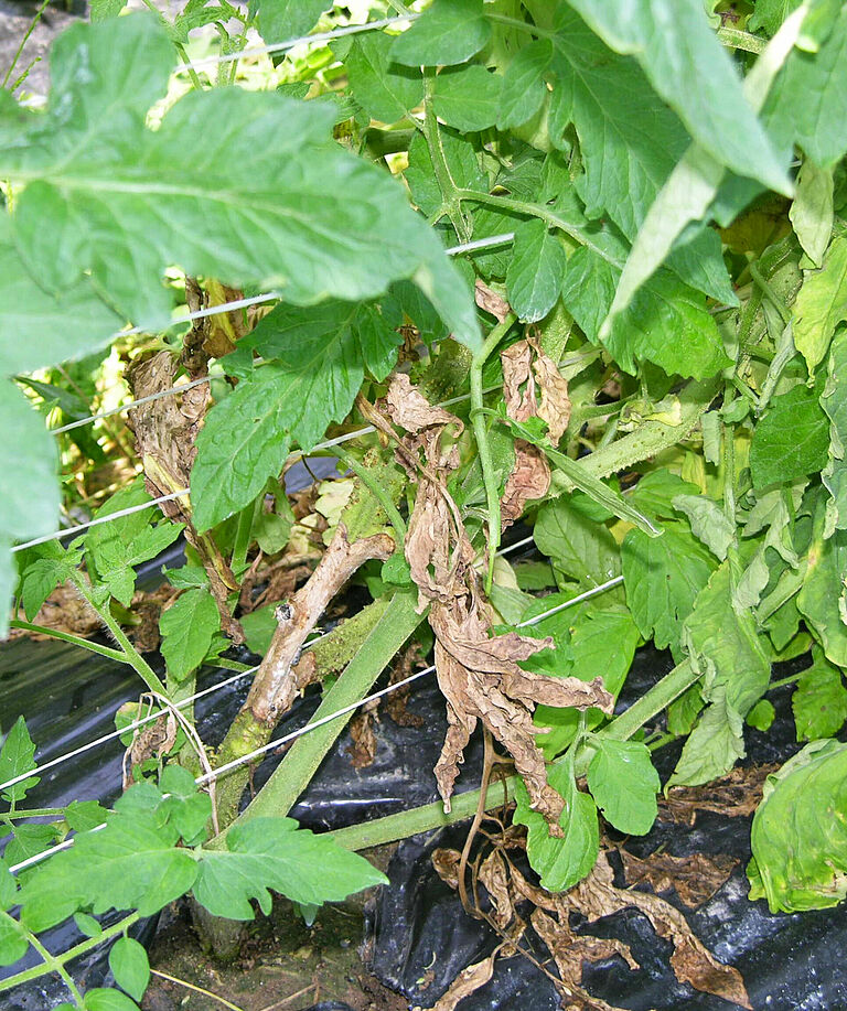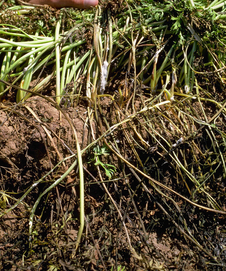 Die Sklerotien keimen direkt und bilden Myzel oder produzieren Apothecien (Fruchtkörper), die Ascosporen enthalten. Das Myzel befällt die Stängelbasis und die Wurzeln, während die Ascosporen die oberirdischen Pflanzenteile infizieren. In Gewächshäusern wird normalerweise nur Myzel durch die keimenden Sklerotien produziert. Der Pilz wächst recht schnell im Inneren der Pflanze und tötet die Wirtszellen ab. Auf dem infizierten Pflanzengewebe entwickelt sich weißes, flauschiges Myzel mit neuen dunklen Sklerotien. Der Pilz infiziert auch Samen und Knollen und schafft so eine Infektionsquelle für die nächste Kultur. Die Ausbreitung auf benachbarte Pflanzen erfolgt durch Myzelwachstum.