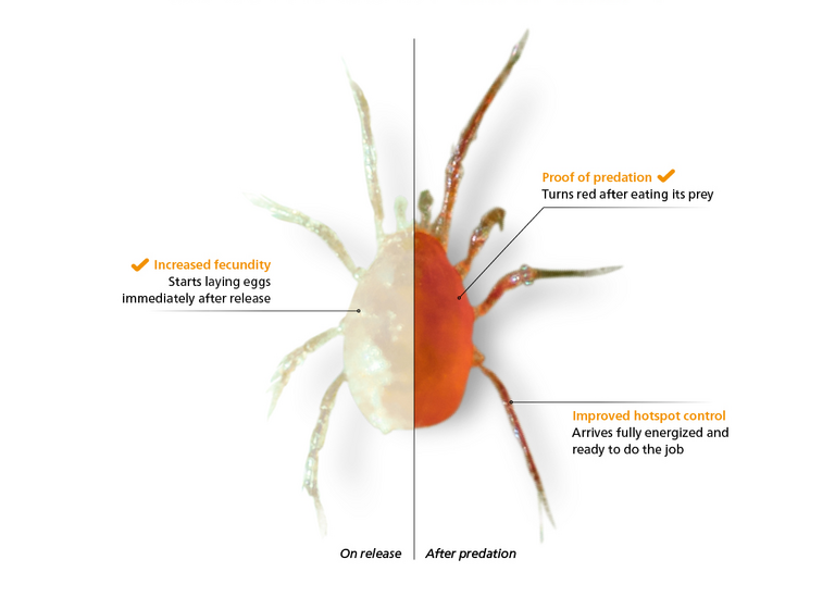 Die verbesserte Formulierung sorgt dafür, dass die Raubmilben einen energiegeladenen Start haben und gut gerüstet sind, die notwendigen Distanzen zurückzulegen. Eine Flasche Spidex Vital enthält eine vielfältige Zusammensetzung der Population, so dass bei der Anwendung in Befallsherden die heranwachsenden Nymphen den Adulten folgen und auch die Eiablage inmitten der geeigneten Nahrungsquelle erfolgt. Diese Faktoren zusammen ergeben eine erhöhte Kontrolle von Hot-Spots.